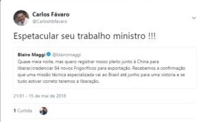 “Espetacular seu trabalho ministro”, escreveu o pré-candidato ao Senado por Mato Grosso, Carlos Fávaro, ao retwittar um post do ministro da Agricultura, Pecuária e Abastecimento, Blairo Maggi (PP). Fávaro é