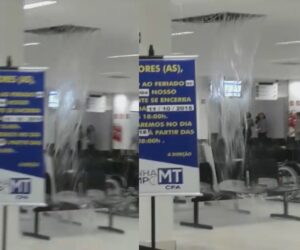 Durante a forte chuva que caiu sobre Cuiabá no fim da tarde desta quinta-feira (11), o teto do Ganha Tempo do CPA 1 desabou. Uma cachoeira se formou dentro do