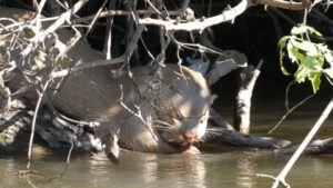 Um grupo de turistas teve uma grata surpresa em uma recente visita ao Pantanal, na porção sul-mato-grossense. A lontra albina vista por eles durante um passeio de barco é uma