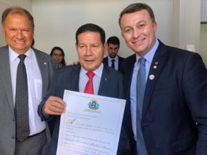 O deputado estadual Xuxu Dal Molin (PSC-MT) entregou o título de cidadão mato-grossense para o vice-presidente da República Hamilton Mourão,
