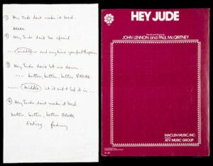 O manuscrito do clássico dos Beatles “Hey Jude”, uma composição de Paul McCartney de 1968, foi vendido por US$ 910