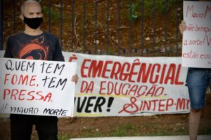Profissionais interinos que atendem as escolas estaduais estão em protesto, em frente ao Palácio do Paiaguás, na tarde desta terça-feira (20). Eles pretendem sensibilizar o governador Mauro Mendes (DEM) e