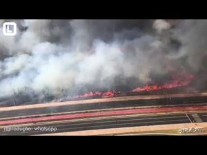 Um incêndio de grandes proporções está sendo combatido na tarde desta quarta-feira (12) nas proximidades de um condomínio de luxo em Cuiabá. Três equipes do Corpo de Bombeiros e outra