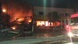 O Corpo de Bombeiros atualizou as informações sobre o incêndio que consumiu totalmente o prédio da empresa Realmat na noite deste sábado (5). Conforme o boletim, foram atingidas outros dois