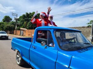 Papai Noel entrega presentes e cachorro-quente a famílias e moradores de rua de Cuiabá