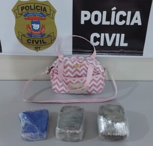 Três tabletes de pasta base de cocaína, que estavam escondidos em uma bolsa infantil, foram apreendidos pela Polícia Civil, nesta