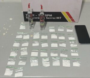 Policiais militares do 19º Batalhão prenderam um homem, de 29 anos, com 34 porções de substância análoga à cocaína e