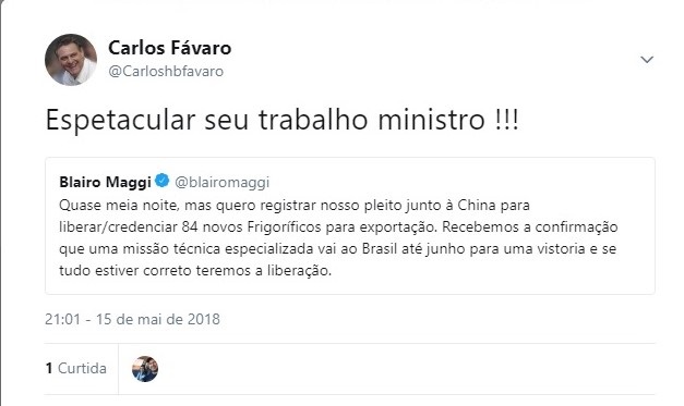 “Espetacular seu trabalho ministro”, escreveu o pré-candidato ao Senado por Mato Grosso, Carlos Fávaro, ao retwittar um post do ministro da Agricultura, Pecuária e Abastecimento, Blairo Maggi (PP). Fávaro é um dos pré-candidatos que esperam o apoio do ministro nas eleições deste ano.