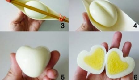 Nas fotos abaixo, há o passo a passo de vários pratos e até mesmo um truque para que o ovo cozido tenha formato de coração.