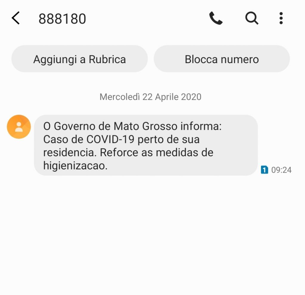 “O governo de Mato Grosso informa: Caso de covid-19 perto de sua residência. Reforce as medidas de higienização”, diz mensagem já enviada.