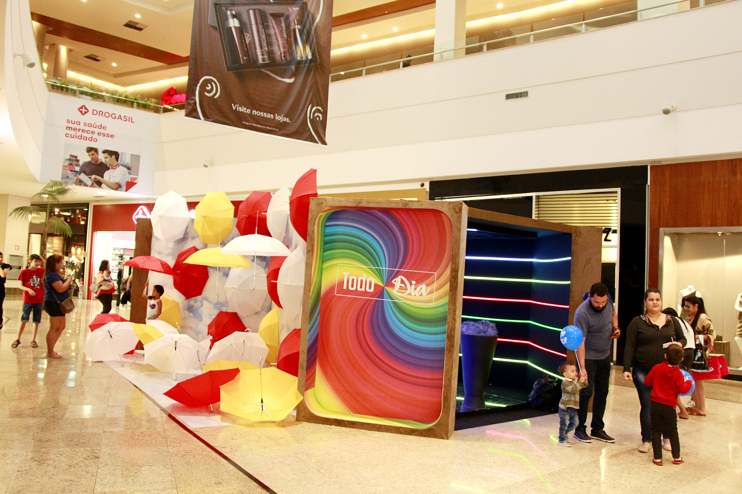 No “Espaço Fitas” – tem fitas penduradas nas cores da marca do Pantanal Shopping, o conceito é simples, mas que traz um efeito bastante visual; “Espaço Todo Dia” – a ideia é simular a tela de um smartphone, onde as pessoas poderão interagir com o slogan do Pantanal Shopping, aliado a espaço bastante moderno e o “Espaço LED” – uma imersão no mundo tecnológico, já que o efeito visual criado pelo jogo de espelhos faz parecer que o usuário esta em um programa de computador.