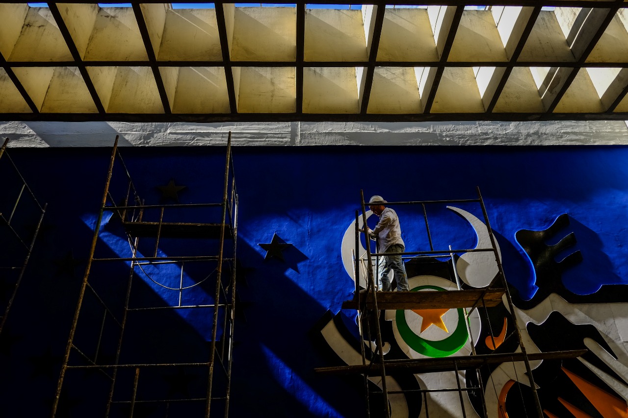 Na restauração deste que é um cartão-postal de Mato Grosso, conta ele, foram executadas técnicas mistas, pois o painel contém três faces externas e é composto por mármore, granito e pintura. São 371 m² que atraem os olhos de quem passa pelo Centro Político Administrativo.