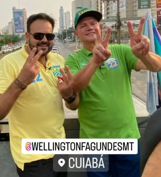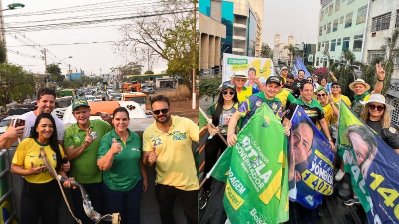 O senador Wellington Fagundes (PL), candidato à reeleição, o pastor Marcos Ritela (PTB), candidato ao governo de Mato Grosso, e alguns candidatos a cargos proporcionais se juntaram à manifestação para cavar espaço de campanha.