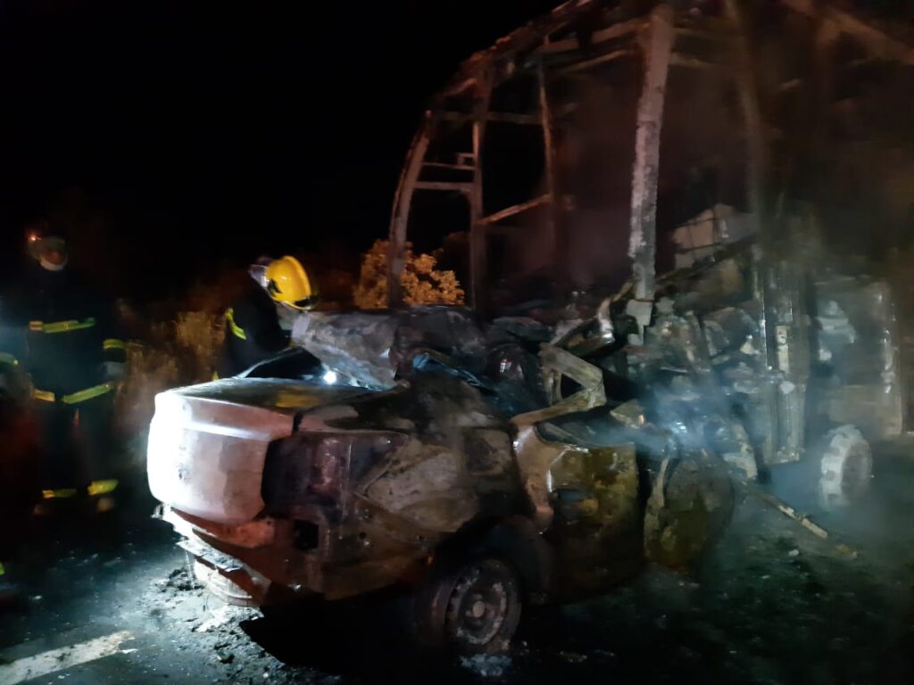 Um ônibus e um carro bateram de frente no início da madrugada desta segunda-feira (11) no KM.448 da BR-364, trecho em Várzea Grande (região metropolitana de Cuiabá) e os dois veículos pegaram fogo.