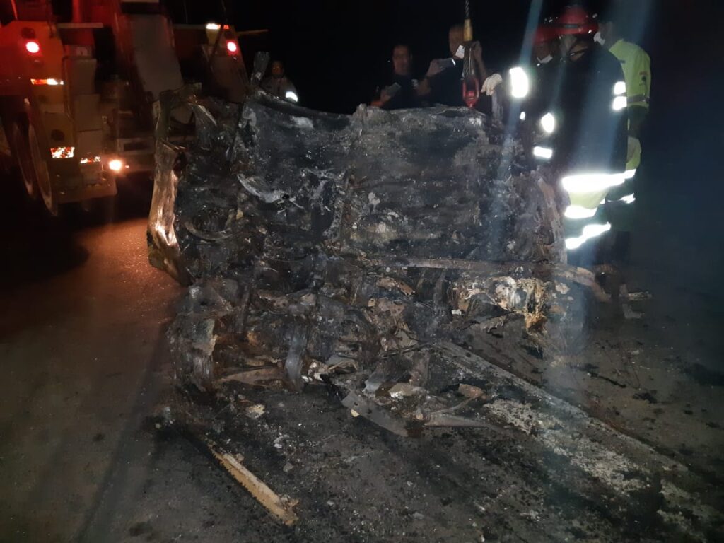 O motorista do carro ficou preso às ferragens e morreu carbonizado. O carro ficou tão destruído que nem o motorista e nem o veículo puderam ser identificados.