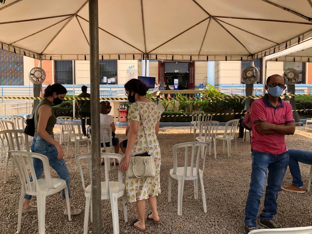 Em outros, não há agendamento e a espera é a mesma, em cadeiras do lado de fora, para “não aglomerar lá dentro”. Com o calor além dos 40ºC, o que se vê são mulheres, crianças e idosos suando embaixo de uma lona – e aglomerados do mesmo jeito.