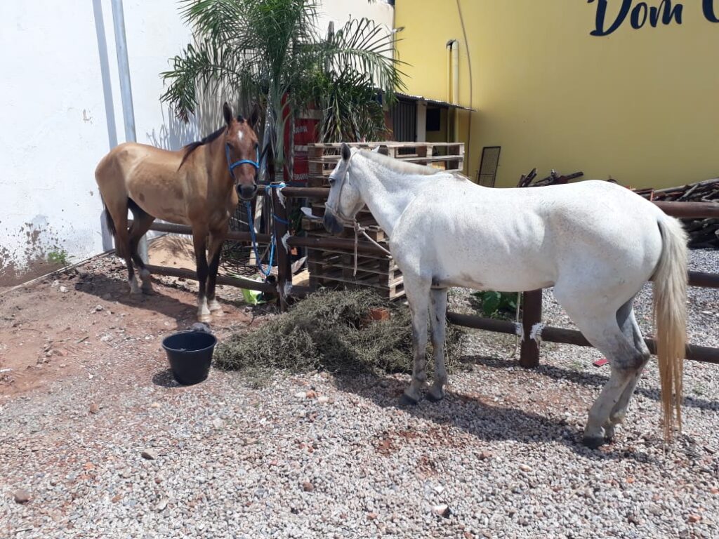 Uma ação diferente moveu a Polícia Militar na manhã de sábado (3), em Cuiabá. Isso porque dois cavalos que estavam “estacionados” em um restaurante, perto de uma via bastante movimentada, precisaram ser resgatados. Segundo a PM, os animais estavam desidratados e assustados, e poderiam atrapalhar o trânsito. O dono dos animais não foi localizado.