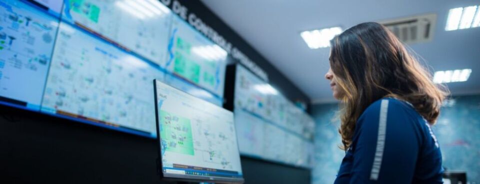 Com oito telas dedicadas ao monitoramento dos sistemas de água e quatro operadores de plantão 24 horas, o Centro de Controle Operacional integra todos os reservatórios e saídas das ETAs, viabilizando o monitoramento dos parâmetros à distância, otimizando os sistemas de bombeamento e o controle de perdas.