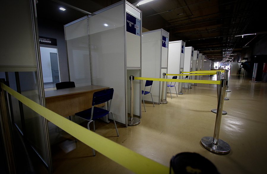As cabines são simples, separadas por estrutura de MDF. Uma cadeira, um computador e um atendente. E a cada uma delas, o paciente ganha um papel novo para levar para a próxima.