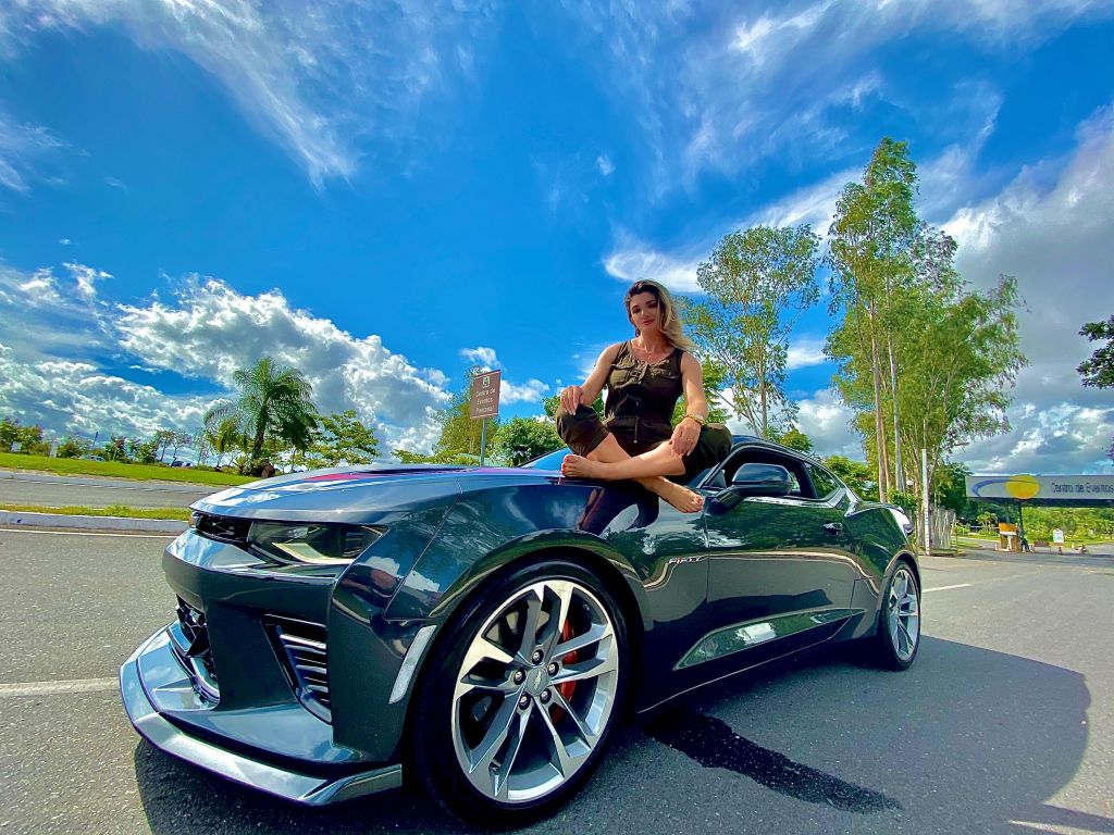 Além destes detalhes, o para-choque tem spoiler pintado na cor do carro e as pinças de freio na cor laranja combinando com os desenhos do capô. E para arrematar com chave de ouro um kit aerodinâmico RS dando mais charme ao Chevrolet Camaro.