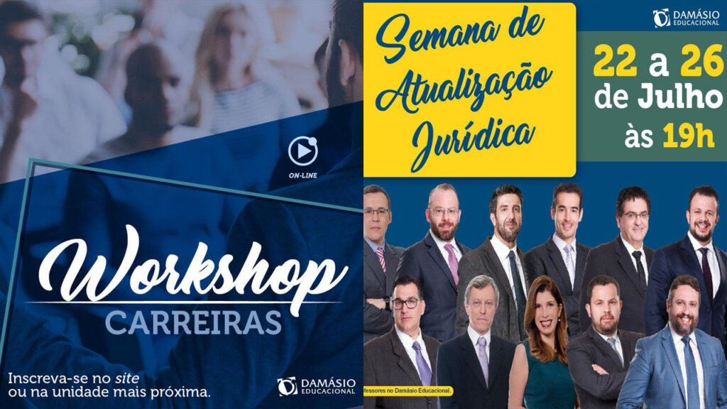 Como parte de sua programação acadêmica e com o objetivo de manter os alunos sempre informados das principais alterações legislativas e das novas tendências jurisprudenciais, o Damásio Educacional promove gratuitamente a Semana de Atualização Jurídica de 22 a 26 de julho, e Workshop Carreiras de 22 de julho a 12 de agosto).