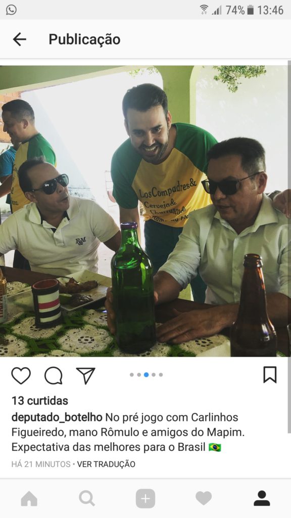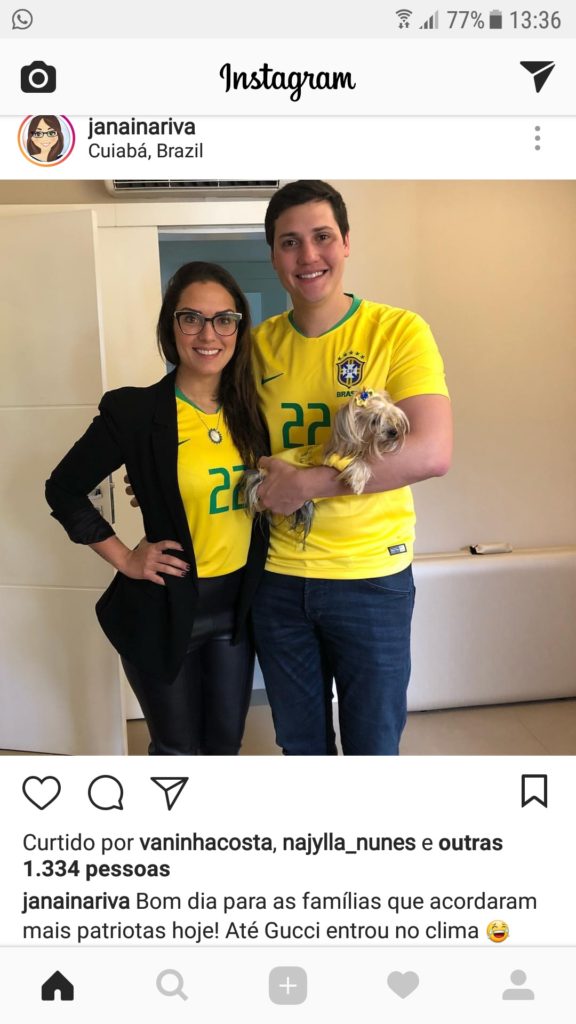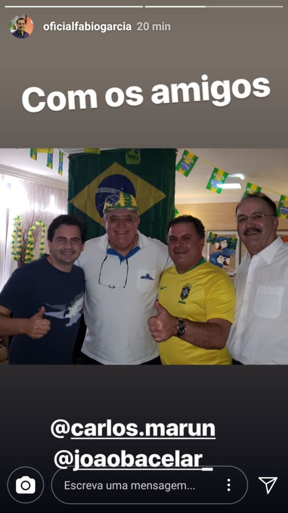 Alguns viram o jogo no trabalho – é o caso do ministro Blairo Maggi (PP), que postou foto com a torcida do Ministério da Agricultura. Outros viram o jogo ao lado de amigos, como o presidente da Assembleia Legislativa, Eduardo Botelho (DEM), e o deputado federal Fabio Garcia (DEM). Entre os que assistiram a partida com a família – e o cachorro –, está a deputada estadual Janaina Riva (MDB).