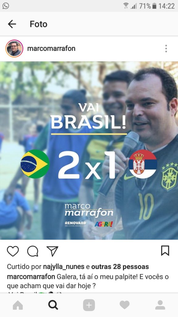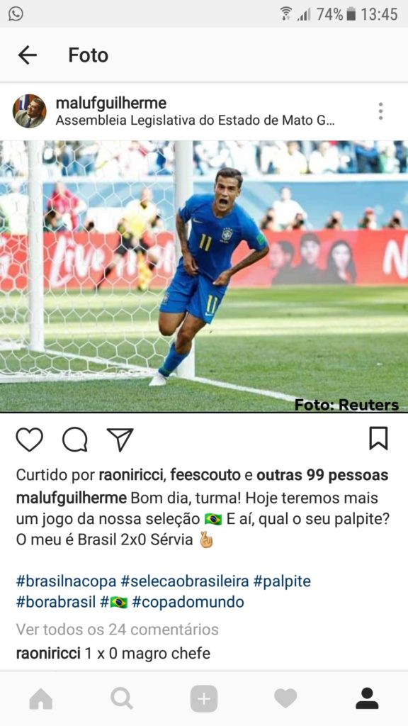 Com a vitória do Brasil no jogo anterior, a torcida estava mais empolgada para o confronto com a Sérvia, na tarde desta quarta. Não foi diferente com os políticos mato-grossenses, que se mostraram otimistas nas redes sociais. A nova vitória, por 2 a 0, consolidou a classificação do Brasil como primeiro colocado do grupo E. Dos que se arriscaram nos palpites antes do jogo, o deputado federal Ezequiel Fonseca (PP) e o deputado estadual Guilherme Maluf (PSDB) estão entre os que acertaram.