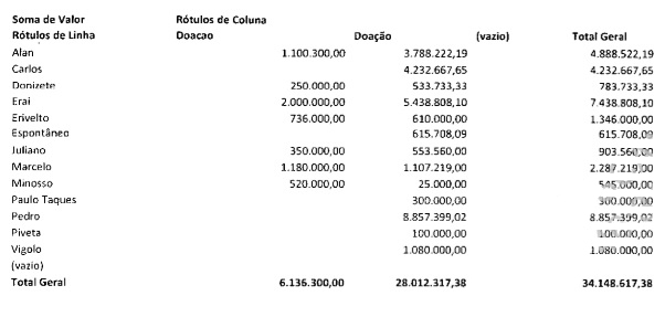 “Somente Júlio Modesto é que saberá exatamente os recursos que efetivamente entraram na campanha, bem como terá o número de exato de contas que foram pagas e fornecedores”, afirmou. O delator alegou ter pago R$ 2,5 milhões de Caixa 2, quanto aos demais empresários, os valores aportados seriam os da planilha abaixo, “podendo existir valores que não se encontram na planilha e não é de conhecimento do peticionante”, disse.