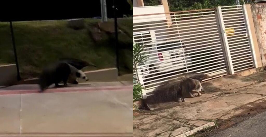 Depois de um jacaré ser visto atravessando a faixa de pedestre próximo ao Parque das Águas, em Cuiabá, agora foi a vez de um Tamanduá-bandeira ser flagrado circulando pelas ruas da Capital mato-grossense.