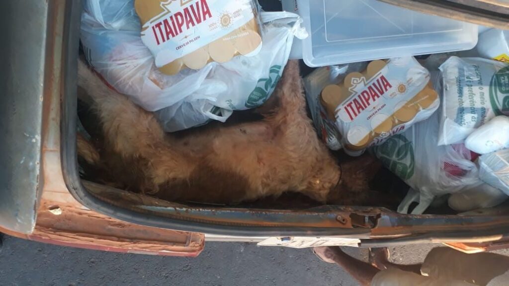 A Guarda Municipal foi acionada por funcionários do mercado, mas quando chegou ao local, o cão já estava sem vida, dentro do porta-malas, em meio a caixas de cerveja.