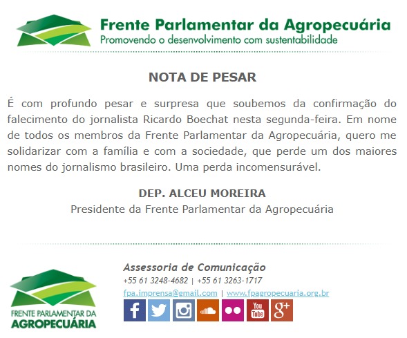 O presidente da FPA, deputado Alceu Moreira disse que com profundo pesar e surpresa recebeu a confirmação do falecimento do jornalista. Se solidarizou com a família e com a sociedade que, ao seu ver, “perde um dos maiores nomes do jornalismo brasileiro”. A publicação ainda finaliza com a afirmação de que é “uma perda incomensurável”.