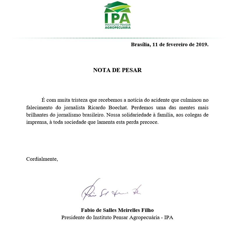 Para o presidente do Instituto Pensar Agro, Fabio Meirelles Filho, a família, colegas e sociedade perdeu Boechat precocemente. Lamentou o ocorrido e ainda afirmou que a morte do jornalista representa a perda de “uma das mentes mais brilhantes do jornalismo brasileiro”.