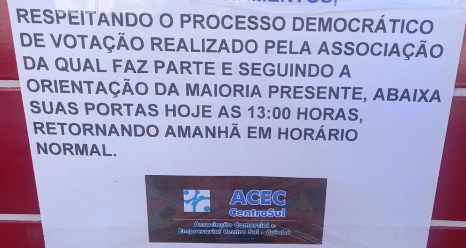 O comércio da região do Porto resolveu baixar as portas após uma votação realizada pela Associação Comercial e Empresarial Centro Sul – Cuiabá (Acec CentroSul), que decidiu pelo fechamento a partir das 13h. Porém, alguns lojistas preferiram não abrir desde o período matutino e realizaram um ato com bandeiras do Brasil em frente ao 1º Batalhão da Polícia Militar (1º BPM).