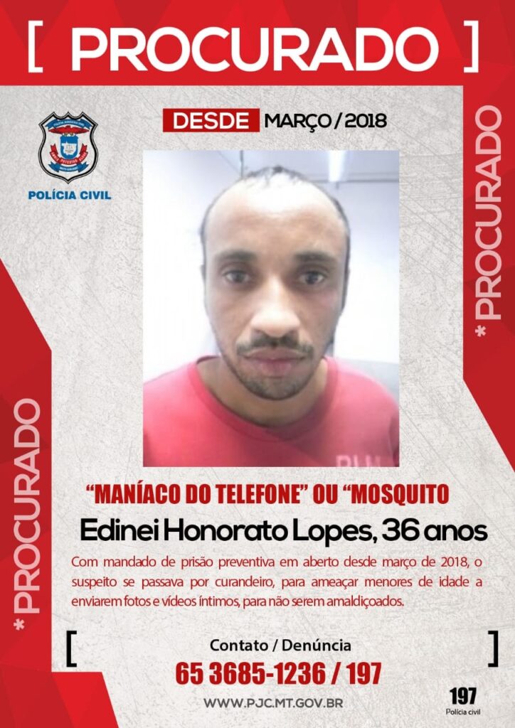 De acordo com a polícia, o suspeito é identificado como Edinei Honorato Lopes, de 36 anos. O homem, conhecido como “Maníaco do telefone” ou “Mosquito”, já foi preso três vezes anteriores e está com mandado de prisão preventiva decretada pela Justiça desde março de 2018.