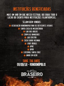Vale destacar que, em sua quarta edição, o Festival Braseiro beneficiou cinco instituições filantrópicas com a doação do lucro obtido no evento – R$111.309,91, valor revertido proporcionalmente aos projetos encaminhados pelas entidades.