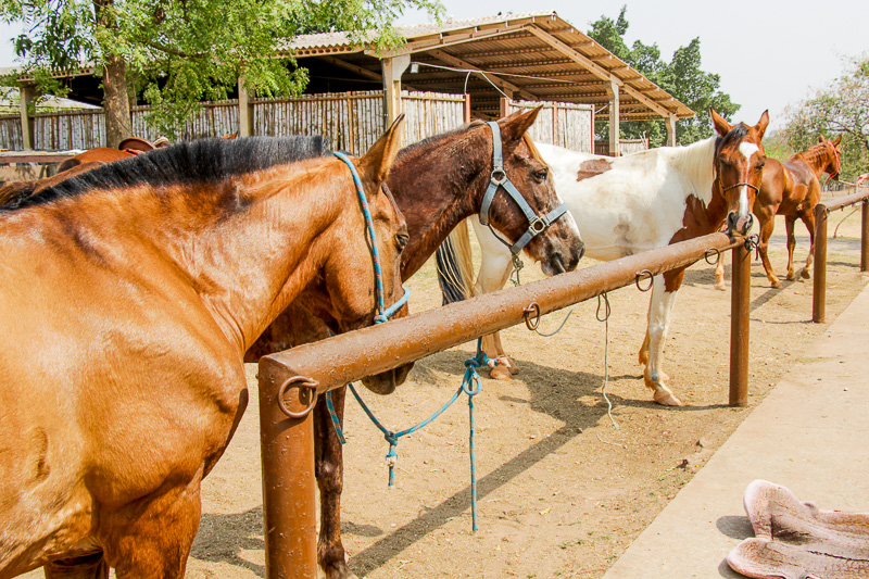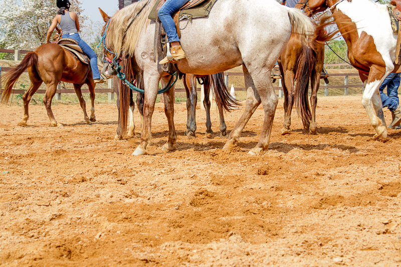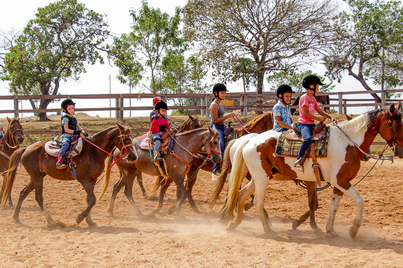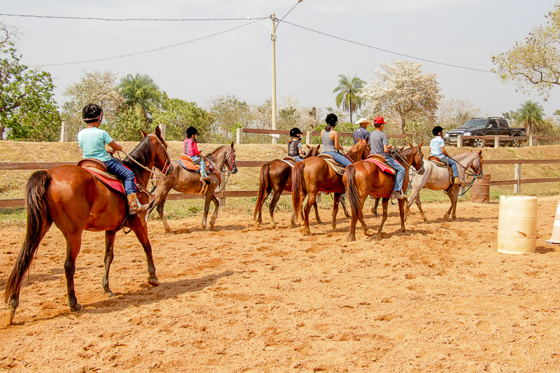 Sempre com muito cuidado, com os equipamentos obrigatórios: coletes, capacetes, botinas, calça jeans e alguns, os mais experientes, até com espora, para não correr risco de se machucar.