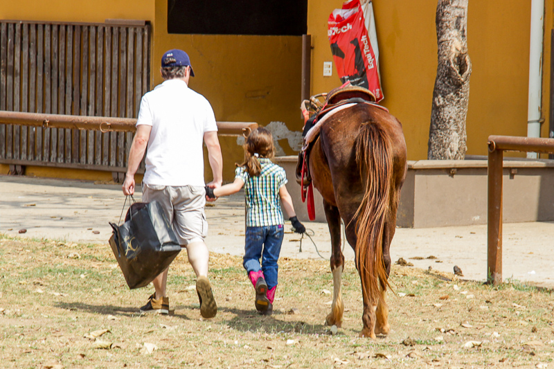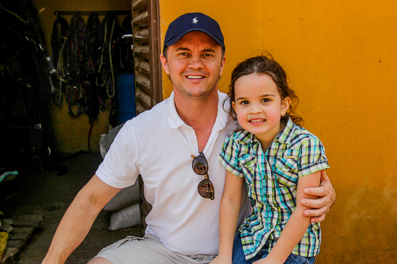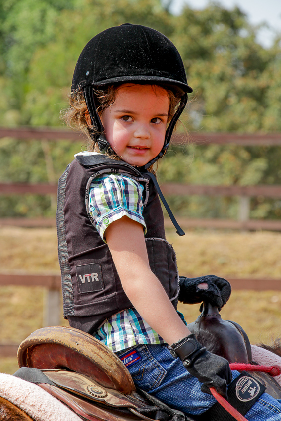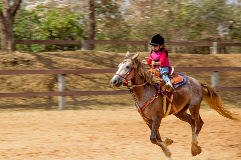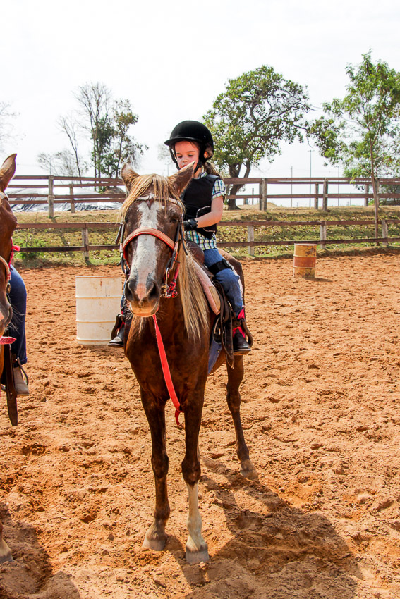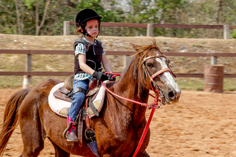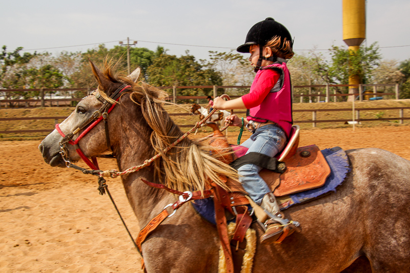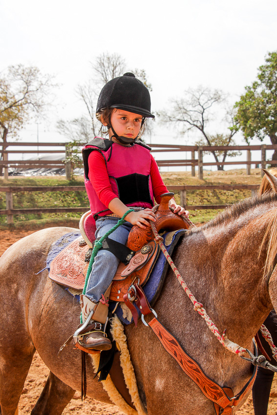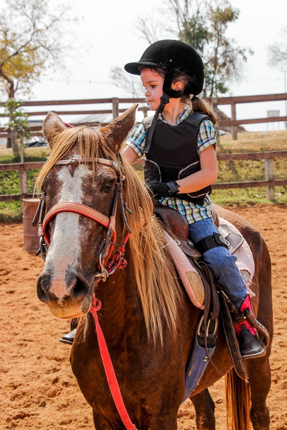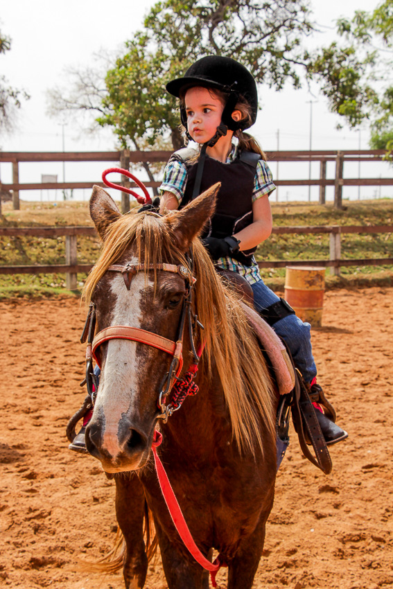 A pequena começou a montar sozinha assim que conseguiu se segurar em cima do cavalo, mas antes mesmo disso já cavalgada acompanhada do pai.