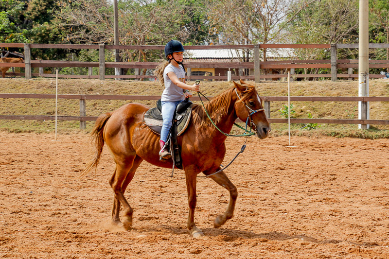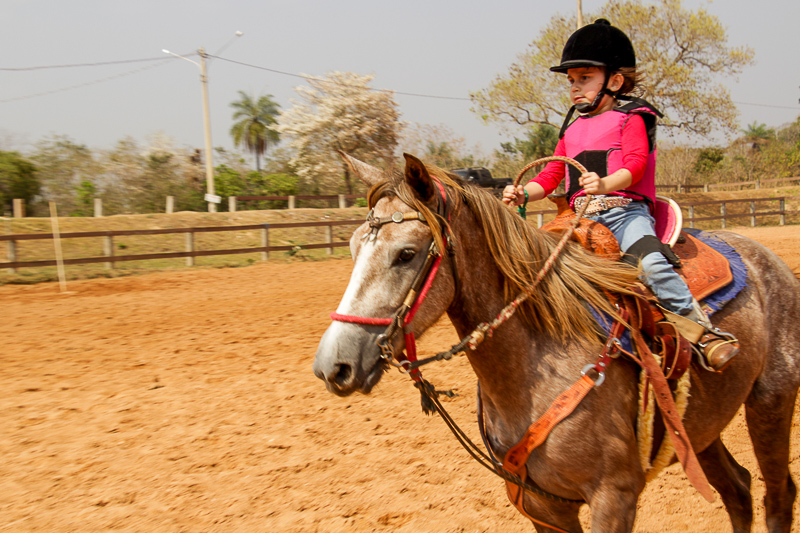 Ela começou as aulas em agosto de 2018 e no mesmo ano já participou da primeira competição, aos quatro anos. Assim como o pai da colega Amanda, o pai dela, o advogado Lucien Pavoni, 45 anos, na primeira competição ficou puxando o cavalo, com medo de que a pequena se machucasse.