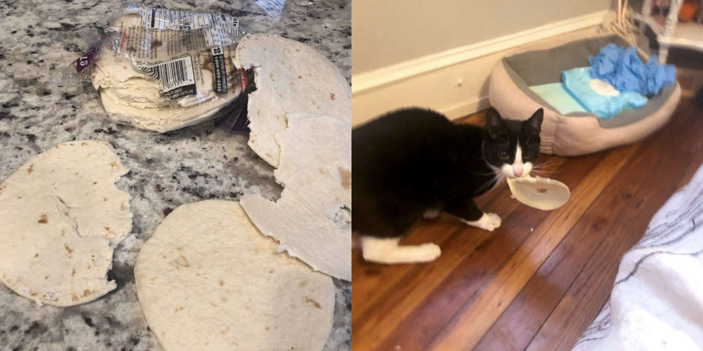 Esse tempo foi suficiente para cowboy fuçar nas sacolas, encontrar um pacote de tortilhas, rasgá-lo e começar a comer. Havia 20 tortilhas e o bichano fez questão de morder todas elas.