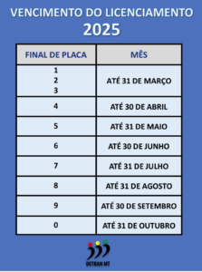 Proprietários de veículos com placas terminadas nos números 1, 2 e 3 devem efetuar o pagamento do Licenciamento 2025 até o dia 31 de março. Para veículos com placa final 4, o pagamento será em abril; final 5, em maio; final 6, em junho; final 7, em julho; final 8, em agosto; final 9, em setembro; e final 0, em outubro.