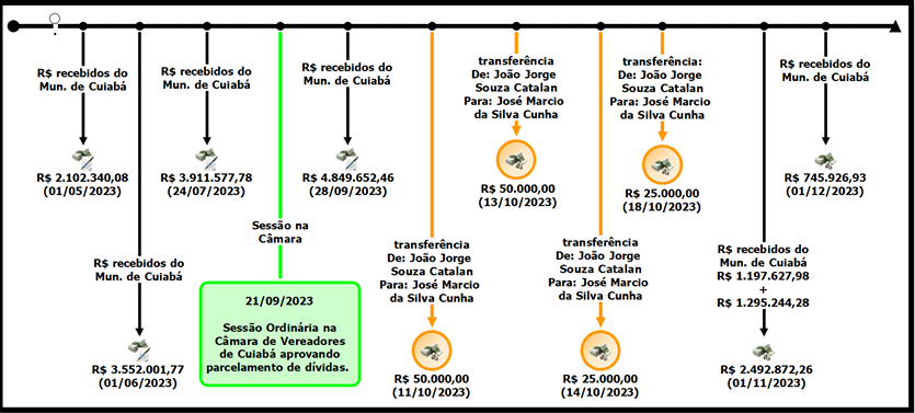 O empresário João Jorge Souza Catalan transferiu R$ 150 mil para conta bancária de José Márcio da Silva Cunha, que aparece como indicado pelo vereador sargento Joelson (PSB) a receber o dinheiro. As transferências foram feitas quatro parcelas após a aprovação de projetos de lei na Câmara de Cuiabá.