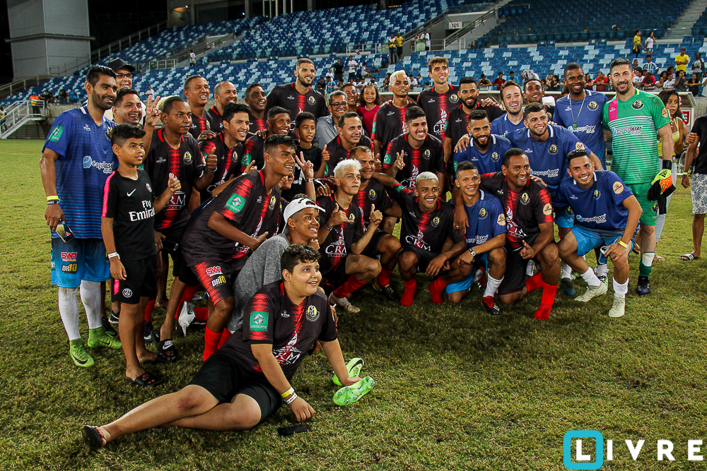 Em noite festiva, a Arena Pantanal recebeu mais de 3,5 mil pessoas para assistir ao jogo beneficente entre os amigos da dupla sertaneja Henrique e Diego e amigos do jogador Brenner da Silva. O evento foi realizado neste sábado (22) e reuniu ex-atletas do futebol, cantores e vários jogadores que defendem grandes clubes do Brasil. A maioria deles mato-grossenses.