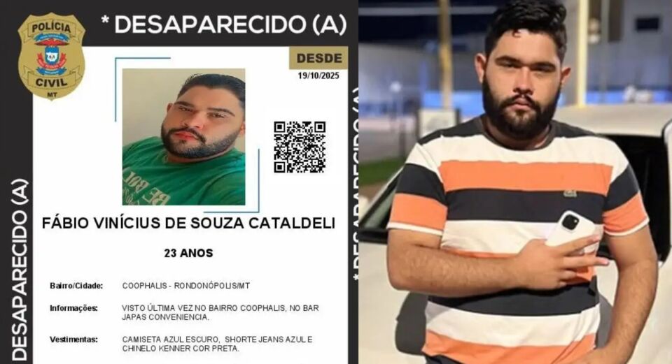 O desaparecimento de Fábio Vinícius de Souza Castaldelli, de 23 anos, intriga a Polícia Civil e preocupa familiares em Rondonópolis (MT). O jovem está sumido desde a noite de domingo (19), depois de sair de uma loja de conveniência.