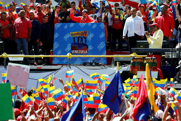 O presidente da Venezuela, Nicolás Maduro, discursou na tarde de hoje (23) para apoiadores na capital Caracas. Em mais de uma hora de pronunciamento, Maduro criticou a ajuda humanitária oferecidas pelos país. Ele classificou, Juan Guaidó, autodeclarado presidente encarregado, de “títere” (marionete) do governo norte-americano” que quer intervir na Venezuela, para ter acesso à exploração de riquezas minerais disponíveis no país, como o petróleo”. O presidente atacou também os presidentes da Colômbia, Ivan Duque, e dos Estados Unidos, Donald Trump.