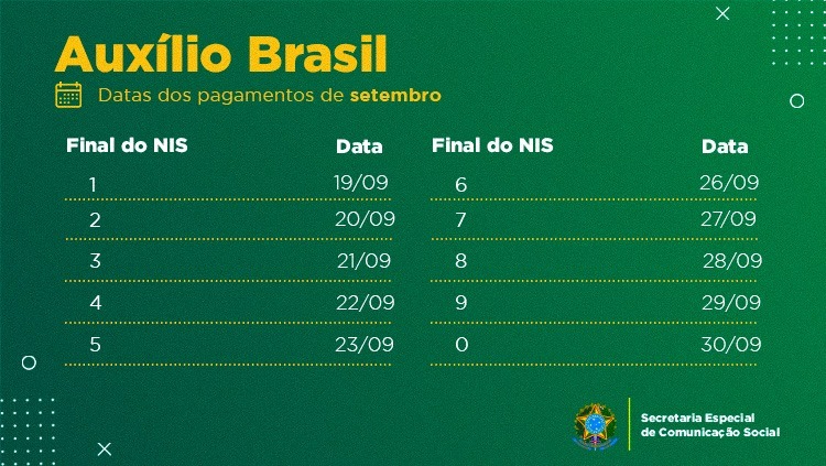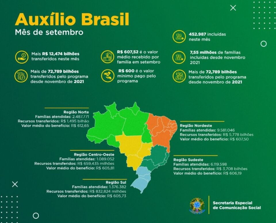 Setembro também marca o segundo mês do novo valor do Auxílio Brasil, cujo benefício passou, em agosto, a ser de no mínimo R$ 600. Neste mês, o valor médio em todo país é de R$ 607,52.