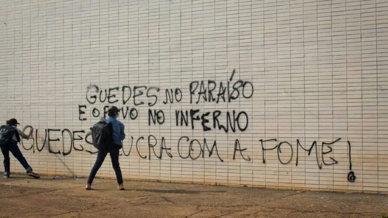 Os manifestantes pixaram ao menos duas grandes frases com indagações ao ministro Paulo Guedes: “Guedes no paraíso e o povo no inferno” e “Guedes lucra com a fome”.