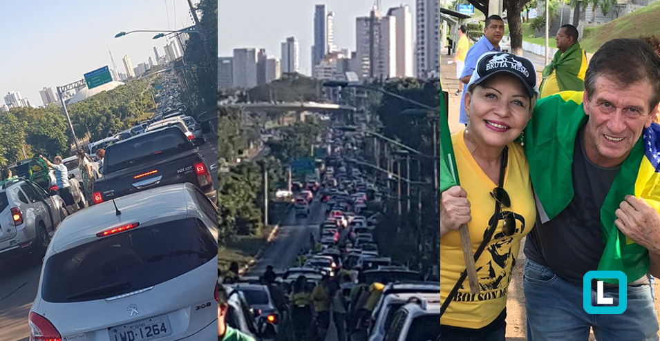 Com bandeiras do Brasil, vestidos com camisetas da seleção brasileira e que estampam o rosto do presidente Jair Bolsonaro, manifestantes cuiabanos percorrem as ruas da capital neste domingo (26), em apoio ao governo federal.