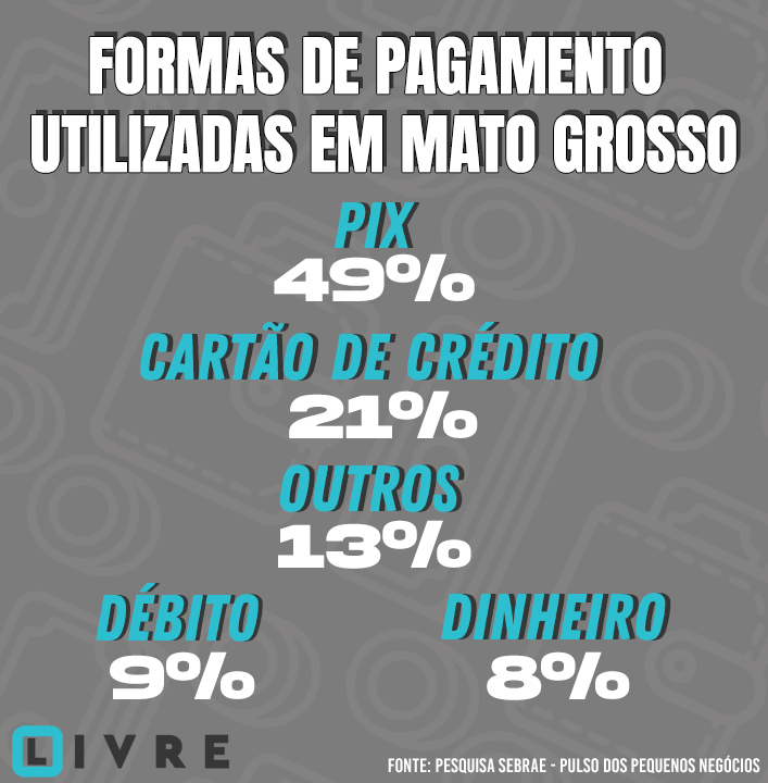 A modalidade Pix é a principal forma de pagamento utilizada por clientes dos pequenos negócios em Mato Grosso, de acordo com 49% dos entrevistados na Pesquisa Sebrae – Pulso dos Pequenos Negócios. Em segundo lugar vem o cartão de crédito (21%). Dinheiro ou débito são as formas menos utilizadas atualmente, 8% e 9%.