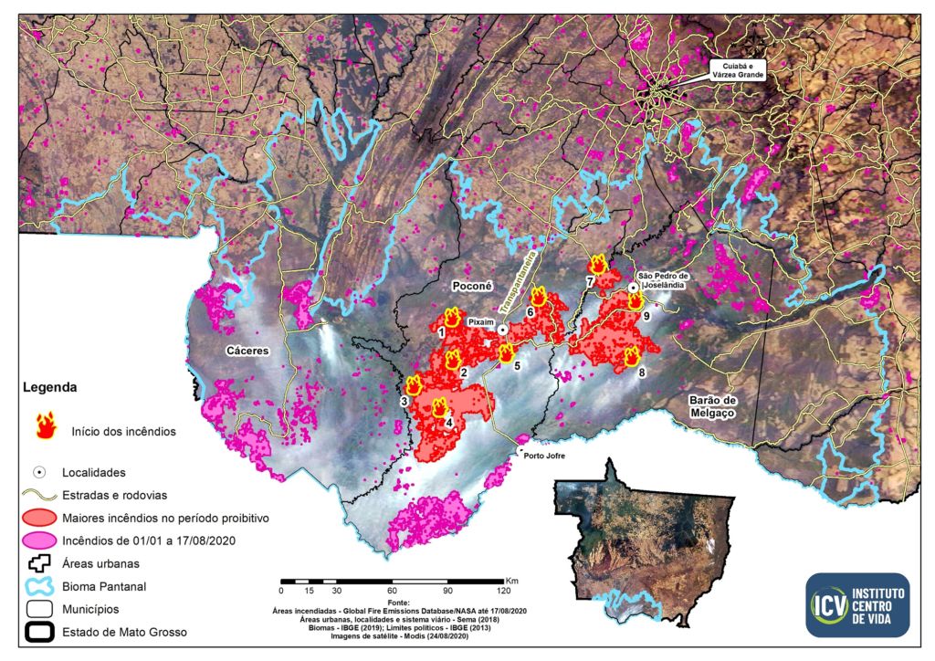 Em Mato Grosso, o período proibitivo das queimadas foi antecipado em função da pandemia do novo coronavírus. Ao longo dos quase 50 dias da proibição, o Pantanal registrou 480 mil hectares de áreas atingidas por incêndios.