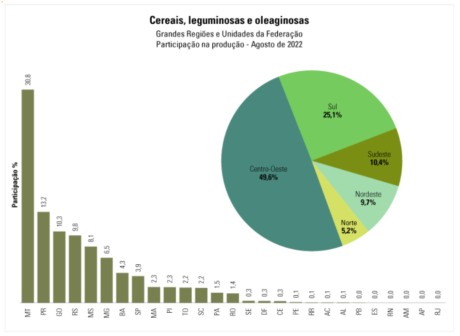 De acordo com a pesquisa, a produção de cereais, leguminosas e oleaginosas no mês de agosto, em todo país, deve totalizar 261,7 milhões de toneladas. A estimativa aponta um aumento de 3,3% em relação ao mesmo mês de 2021 e 0,7% abaixo do registro de julho.